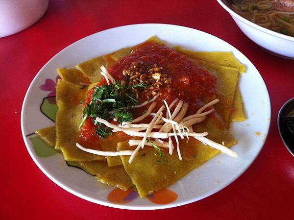 老闆娘推薦的黃米做的粿,是吃涼的,淋上番茄醬料跟豆芽菜香菜,好吃很特別!看到不少人來買外帶,老闆娘說這是傳統家常食物。