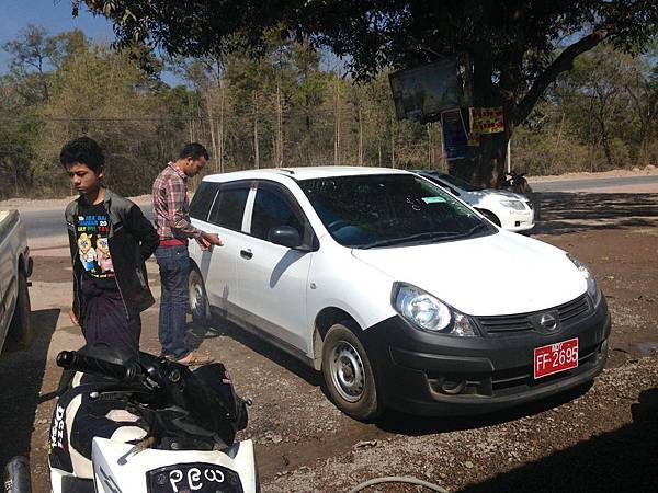 緬甸除了包車,shared taxi 也是很常見的交通方式,小背包請旅館幫忙訂早上10:00的shared taxi 到彬烏倫,車資一人:7000K = NT$210,door to door,車子會到旅館來接人,送你到彬烏倫入住的旅館,或任何你指定的地方。這一台白色轎車就是今天的shared taxi。