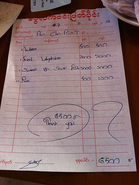 這家的菜很好吃喔!難得在緬甸吃到色香味俱全的好料理,這一餐加上白飯跟一瓶水= 6500K= NT$195。
