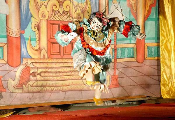 看著舞台上木偶煞有其事的邁著步伐,小背包發現舞台後背景布幔下,師傅不小心露出的雙腳,非常有韻律感的踩著跟木偶一樣進進出出的步伐!飛。走。踢~空中翻騰~真是豪~厲害啊! 手比八爪章魚還要忙的師傅,不只是要專注手部的收放控制,真正精準掌握節奏的,是布幔下那一雙跳曼波的雙腳,前前後後左左右右,一整個很傳神耶!手藝精湛,舞藝也高超啊!好像已經出神入化跟木偶融為一體,每晚粉墨登場,共同演出一齣齣精彩的緬甸傳統戲曲!!!