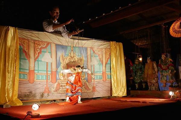 晚上再來時就只有點杯果汁,預計是半小時的演出,不過這天老闆偷懶縮水成20分鐘。演出的音樂與說唱的內容是放CD,未上場的木偶就晾在一旁等待,師傅控制著木偶身上各條複雜的線,瞬間木偶手足舞蹈變得活潑而生動,非常精彩,雖然觀光客們完全聽不懂也搞不清楚在演什麼故事,大家還是看得津津有味。