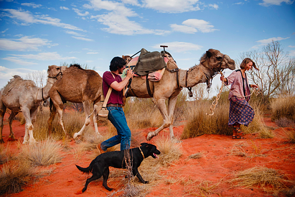 旅程剛開始時只有三隻駱駝,後來才又加入ㄧ隻母駱駝中途生下的駱駝寶寶,沙漠遠征團隊的成員除了四隻駱駝,還有一隻忠心陪伴的黑狗叫Diggity,多次替Robyn 解危令人相當感動。 (下圖:電影中,Rick 拿著攝影機追著不情願被拍照的Robyn)