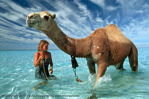 這樣一個壯舉不僅徹底改變了Robyn 往後的人生,猜想這幾隻原本一生宿命要待在澳洲內陸的駱駝,長途遠征後一腳踏進沁涼碧綠海水裡的那一剎那,應該也驚呆了吧?!以為一輩子要與沙漠為伍的駱駝,卻因為被徵招去旅行而發現海洋,世界的面貌,真的不是課本說了算,要自己去闖蕩一下,親眼見識,才能體會變成自己的生命風景。 而當時拍下這張讓世人驚豔的照片的國家地理雜誌攝影師 Rick Smolan,因緣際會也成了這個故事的一個重要角色。